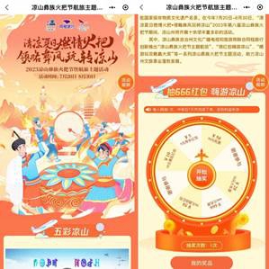 7月20日-8月30日活动期间,用户在同程旅行小程序首页搜索"凉山"进入凉山航旅专题活动界面即可免费抽奖1次,每人1次机会,最高666元主题航班红包以及火车票、酒店、景点、打车等出游福利,通过丰富多元的形式,为用户提供大量优惠、优质的旅游产品和服务。